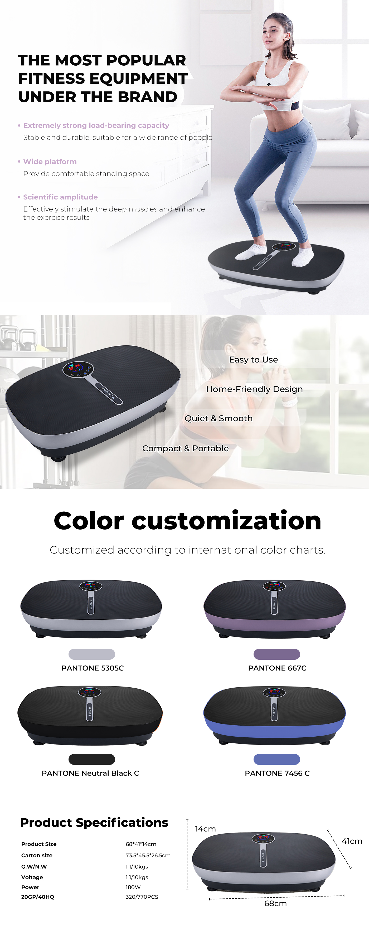 1.Lose Weight Faster——Vibration Plate will enhance your exercise to burn fat and clear cellulite in half the time. Our vibrating plate exercise machine will help stimulate your every muscle and activate natural lymphatic drainage to boost detox and natural weight loss.