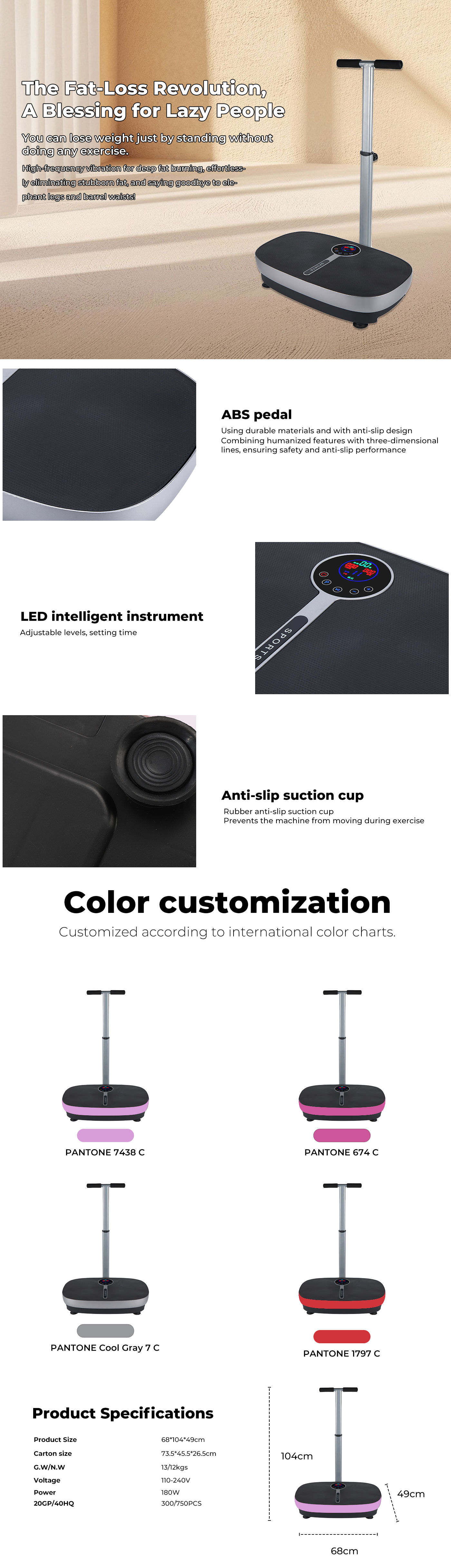 1.Lose Weight Faster——Vibration Plate will enhance your exercise to burn fat and clear cellulite in half the time. Our vibrating plate exercise machine will help stimulate your every muscle and activate natural lymphatic drainage to boost detox and natural weight loss.