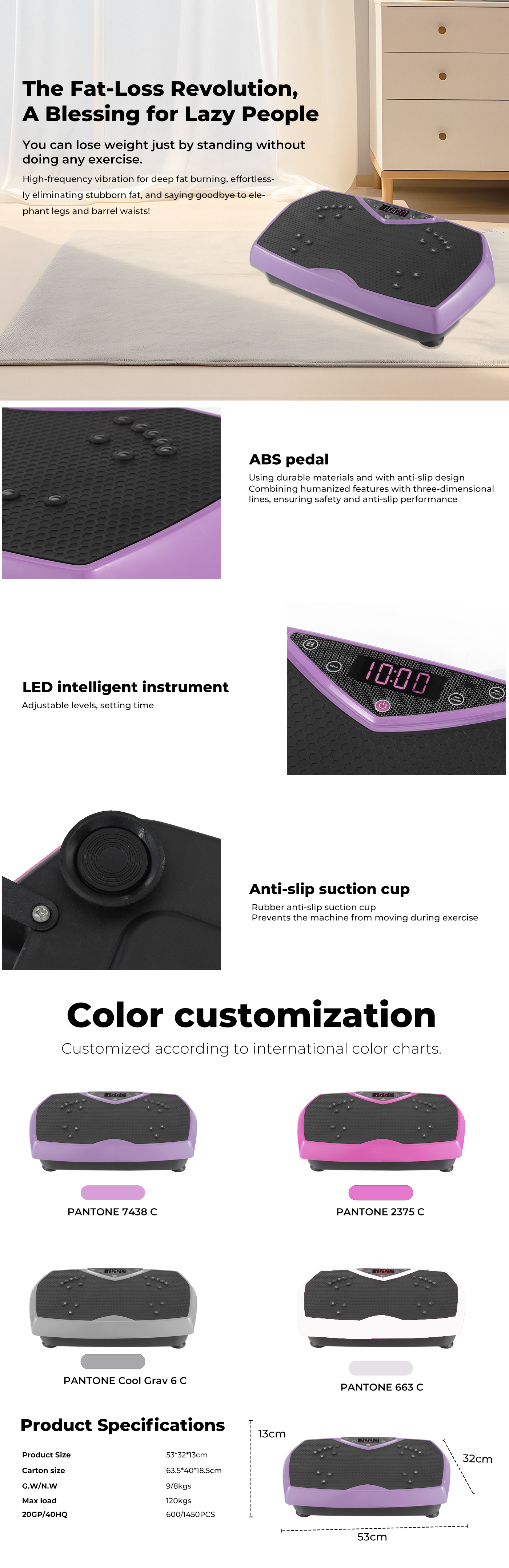 Made of durable materials and a sturdy construction, the vibration plate can withstand workouts of all intensities without sacrificing performance. Its stylish color design is not only visually striking but also incorporates practical features, such as a sturdy black reinforced grip pad with a hexagonal pattern for stability during exercise. This makes it ideal for those who want to maintain balance and support during high-intensity workouts.